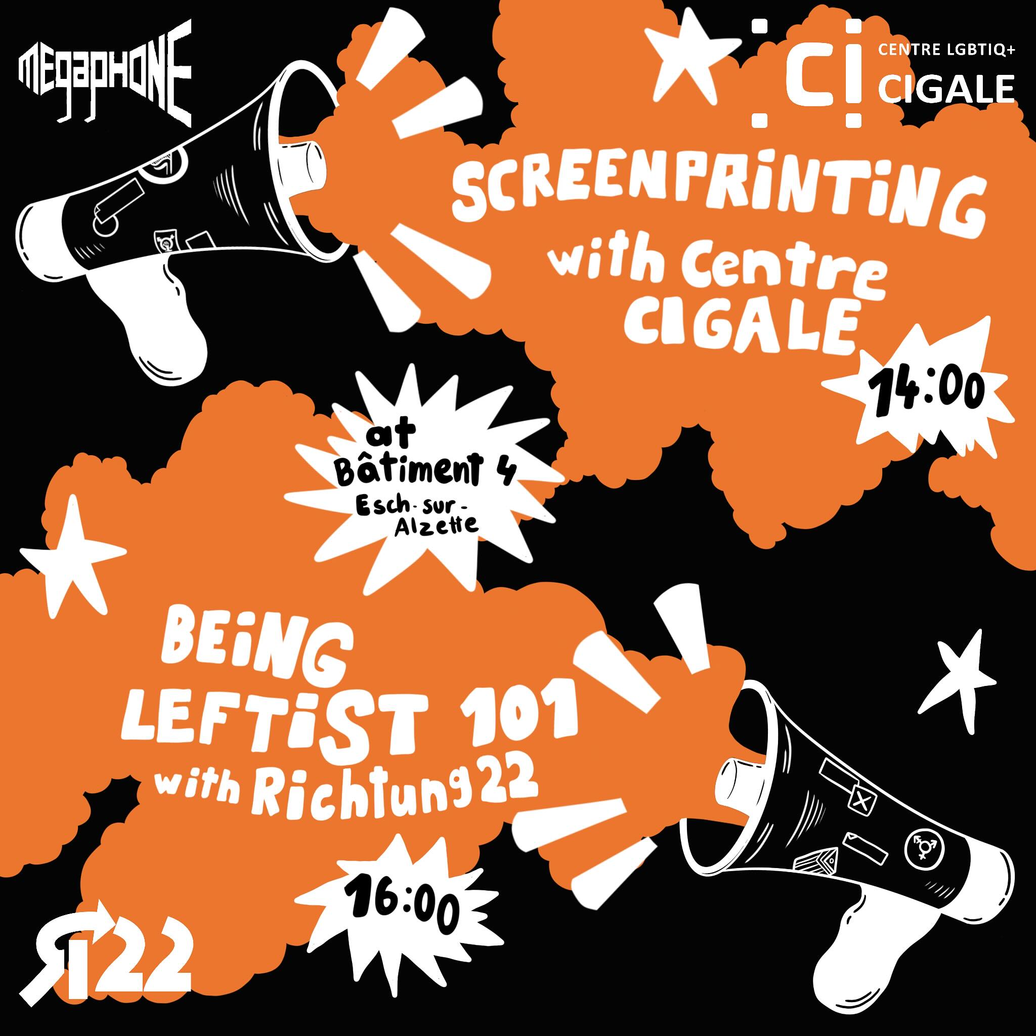 We will do a screenprinting workshop with @centrecigale (They will provide totebags and t-shirts but you can also bring your own things!) and a workshop about all things militant (How to organise a demo? How to banner? How to mutual aid? Etc.)